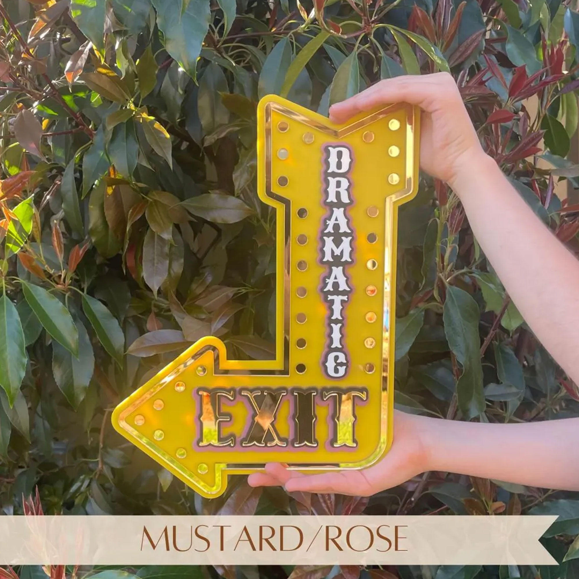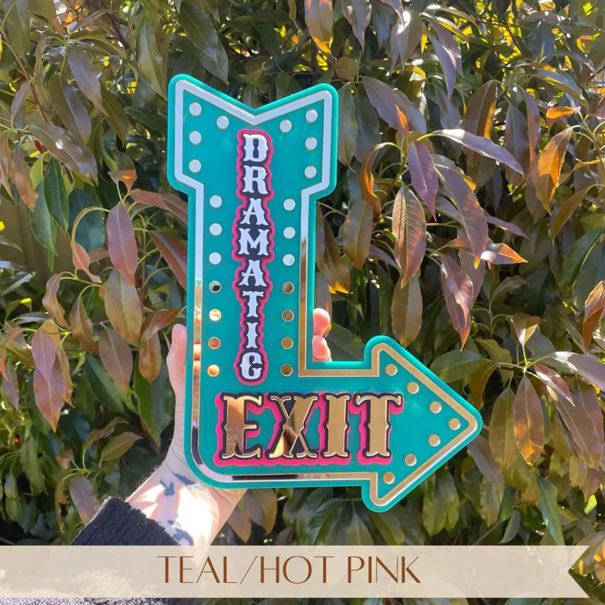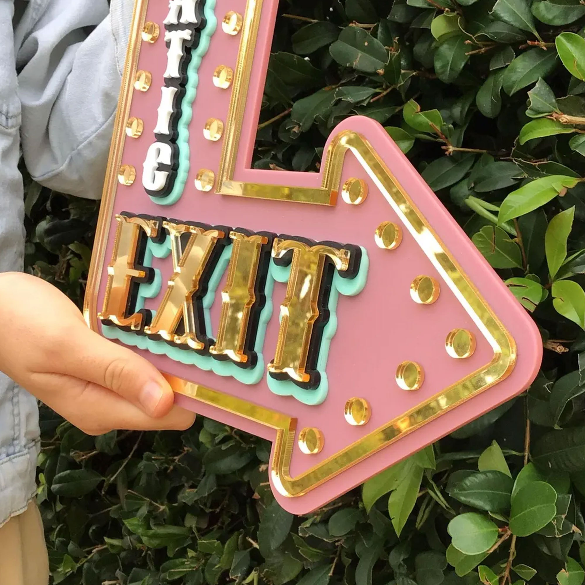 Bold Marquee Design – This eye-catching arrow-shaped sign features a retro marquee style with a vibrant pink base, gold mirror trim, and rows of shimmering gold dots that mimic classic theater lighting—creating a striking pop-art aesthetic.